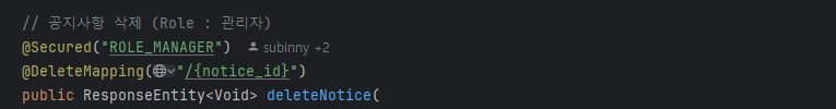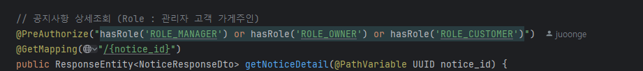 공지사항 작성 시, 예를 들어 관리자인 ROLE_MANAGER나 가게 주인인 ROLE_OWNER만 작성할 수 있도록 제한하고 싶다고 가정해봅시다. 이 경우 @PreAuthorize를 사용하여 이러한 역할을 가진 사용자만 메서드에 접근할 수 있도록 설정할 수 있습니다.