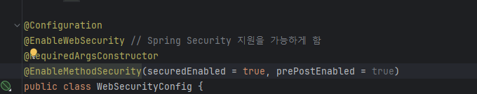 이렇게 작성하여야 @Secured, @PreAuthorize, @PostAuthorize 활성화가 됩니다.
